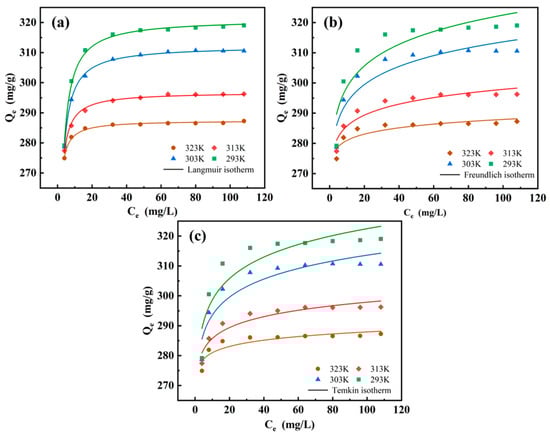 The isothermal studies were used to analyse the adsorption mechanism between the adsorbent and the adsorbate. Herein, the adsorption performances of the MCTS-CMS polymer at four different temperatures were characterised using the Langmuir (Equation (5)), Freundlich (Equation (6)), and Temkin (Equation (7)) isotherm models. The fitting curves and isotherm parameters are presented in Figure 11 and Table 2. The comparison of the fits of the three models showed that the Langmuir model explained the adsorption better than the other models in accordance with its higher correlation factor (R2) at different temperatures. This result indicates that the adsorption is a homogenous process in which Cu(II) is adsorbed in the form of a monolayer on the MCTS-CMS polymer, occurring at a fixed number of adsorption sites. Furthermore, the adsorption of the adsorbate on the surface is independent of the presence of other molecules, and there is no interaction between the molecules. This finding aligns with the results presented in Section 3.2.4. The maximum adsorption capacity of 321.16 mg/g, as determined by fitting the Langmuir isotherm model, is close to the experimental value of 317.29 mg/g from the adsorption experiment. Furthermore, the maximum adsorption capacity of the CTS-CMS polymer was 162 mg/g, and that of MCTS-CMS was significantly increased [35]. This result indicates that the modification effectively enhances the polymer’s ability to adsorb copper ions.