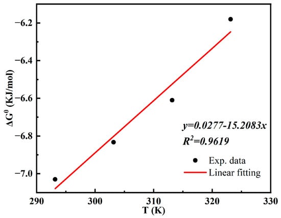 In this formula, the R value is 8.314 J/mol K, T (K) represents the Kelvin temperature of the reaction, and KC (L/mol) represents the equilibrium constant of the Langmuir isotherm. Additionally, the relationship among the enthalpy change (), entropy change (), and Gibbs free energy change (Δ) can be expressed as follows: