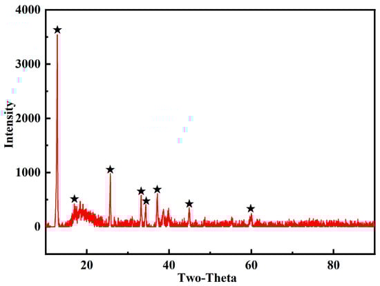 The crystal state of the copper adsorbed on the surface of the MCTS-CMS polymer was investigated. According to the peak data from the No. 83-1410 PDF, the adsorbed material is posnjakite (Cu4(SO4) (OH)6 (H2O)), as shown in Figure 13. The specific XRD data of the MCTS-CMS polymer after Cu(II) adsorption are listed in Table 4. The interplanar spacing and average crystal diameter were 73.76 and 0.32 nm, respectively.