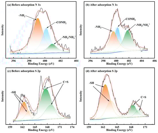 As shown in Figure 14c,d, the peaks with binding energies at 161.9 and 163.1 eV were attributed to the thiol group without adsorption, and those with binding energies at 167.5 and 168.7 eV were ascribed to the C=S group [48,49]. The binding energies of the original peaks changed after the reaction with copper ions. The binding energies of the thiol group changed to 162.5 and 163.7 eV and those of the C=S group to 168.42 and 169.6 eV. Therefore, the thiol group and C=S group are involved in the adsorption of copper ions.