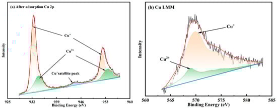 By observing the narrow-scan spectra of Cu and noting that there is only a weak satellite peak at around 945.0 eV, it can be inferred that copper ions mainly exist in the form of Cu(I). During fitting, the G-L values of Cu(I) and Cu(II) ions should differ, with the former being around 20% and the latter generally exceeding 70%. Additionally, the FWHM of Cu(I) is 1.62 eV, while that of Cu(II) is broader, at 3.15 eV. The Cu 2p spectra are shown in Figure 15. Each spectrum consists of two Gaussian–Lorentzian bands separated by 19.75 eV and comprises two sets of peaks and a satellite peak. The peaks with binding energies at 932.4 and 952.2 eV were attributed to Cu(I), and those with binding energies at 933.9 and 953.7 eV were attributed to Cu(II) [50]. The satellite peak at 944.4 eV exhibited a relatively low intensity. It was also identified as the Cu(I) satellite peak and indicates the existence of Cu(I) [46]. The Auger spectrum of the copper cannot be analysed using the conventional Gaussian–Lorentzian peak-fitting method; instead, the nonlinear least square (NLS) method should be employed for peak deconvolution and identification of chemical states to enable the accurate determination of the proportions of copper in different valence states. According to the Auger peak of the copper, the peak area ratios of monovalent copper (Cu(I)) and bivalent copper (Cu(II)) ions are 81.21% and 18.79%, respectively. The copper ions, primarily existing in a monovalent form, are mainly adsorbed through chemical adsorption because physical adsorption does not alter the valence state. Therefore, the high area ratio of Cu(I) illustrates that chemisorption and physical adsorption exist, but chemisorption predominates in the Cu(II) adsorption of the MCTS-CMS polymer.