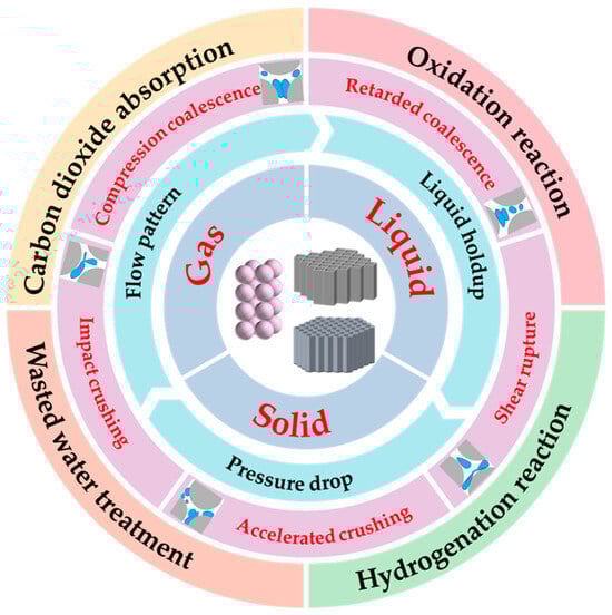 Gas–liquid systems are widely used in various applications, such as chemical reactions [1,2,3], extraction [4,5], gas separation [6,7], and material synthesis [8,9]. The packed bed reactor has the advantages of flexibility, simple operation, and large processing capacity, and has been extensively utilized in the chemical industry, including the petroleum refining [10,11,12,13,14], petrochemical [15,16], biochemical [17,18], environmental [19,20], electrochemical [21], fine chemical, and pharmaceutical industries [22,23]. The packed bed improves separation efficiency in the gas–liquid separation process by increasing the contact area and promoting effective gas–liquid interaction. The design and arrangement of fillers can enhance the interaction between gas and liquid and improve the separation efficiency. They help to improve the uniformity of gas–liquid distribution and reduce pressure drop while increasing processing capacity and reducing energy consumption. However, due to the uneven distribution of liquid and incomplete wetting of fillers, the packed bed reactor also suffers from some problems, such as an uncontrollable reaction process, low production efficiency, and unavailable by-products, which limit its further application in the chemical industry. Therefore, enhancing reaction performance within packed bed reactors is essential for efficient application to meet green chemistry requirements. Furthermore, even minor improvements can lead to significant cost savings along with economic benefits, making it crucial to design packed bed reactors while considering the hydrodynamic aspects of gas–liquid dispersion systems.