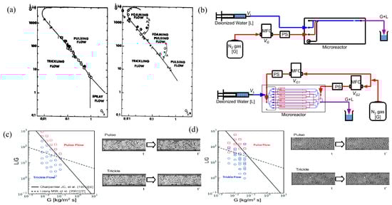Charpentier and Favier [40] proposed a flowchart based on Beck coordinates, which has been widely used in conventional packed bed reactors. Figure 2a describes the flow patterns and the transition from one structure to the other in foaming and non-foaming systems. The lines separating flow patterns in these graphs are actually transitional flow patterns, not abrupt points from one flow pattern to another. In both figures, the lines separating the trickle from the other flow patterns are the same. According to Charpentier and Favier [40], it is the transition line between the small gas–liquid interaction states (trickling flow) and the large gas–liquid interaction states (bubbly flow, pulsing flow, and spray flow) defined by Satterfield (1975) [41] and Charpentier et al. (1971) [42]. The transition line was previously obtained with an air–water system for 3 mm packing in a 10 cm column by Charpentier et al. (1971) [42]. Tomoya Inoue et al. (2015) [38] designed and fabricated a parallel packed bed microreactor appropriate for the direct synthesis of hydrogen peroxide from hydrogen and oxygen. The reactor uses a microfluidic design to uniformly distribute the reaction fluid to each catalyst packed bed, and the design is verified by reactor performance and gas–liquid flow visualization. Figure 2b shows the flow visualization schemes of the 1 ch (top) and 8 ch (bottom) reactors, respectively, and Figure 2c,d show the flow visualization results of the 1 ch and 8 ch reactors on the Charpentier–Favier coordinate diagram, as well as the time slice images of pulse flow and trickle flow, respectively. Typically, it is difficult to visualize this two-phase flow behavior in a normal packed bed, even if the test part is made of a transparent material, due to light reflection/refraction and/or bubble overlap. To avoid bubble overlap and clearly identify flow patterns, Yasugi et al. (2021) [43] fabricated a test cross section simulating a two-dimensional porous structure network. Using high-speed imaging techniques on two-dimensional network models, the two-phase flow pattern in the porous structure was determined. The two-phase flow characteristics of the quasi-two-dimensional test section were observed using a high-speed camera. In order to observe the bubbles more clearly, the two-phase flow image was normalized in the liquid phase image and the obtained typical images of bubbles, slug flows, and ring flows.