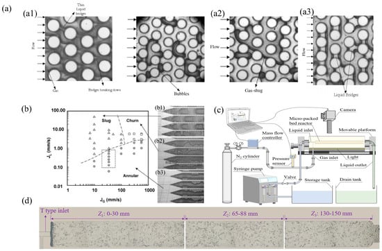 Krishnamurthy et al. (2006) [44] conducted an experimental study on the adiabatic nitrogen water two-phase flow through a group of staggered circular microcolumns with a diameter of 100 μm and a pitch to diameter ratio of 1.5 within the Reynolds number range of 5 to 50, and discussed the flow mode. The results were compared with those obtained from large-scale and micro channels. Based on flow visualization, four types of two-phase flow modes were observed in the μPBR: bubble slug flow (Figure 3(a1)), gas slug flow, bridge flow (Figure 3(a2)), and annular flow (Figure 3(a3)). Wada et al. (2006) [45] performed flow visualization using oxygen and ethyl acetate to investigate the multiphase flow patterns under reaction conditions (Figure 3b). At low liquid–gas flow rates under all gas flow rates, an “annular flow (Figure 3(b3))” pattern was observed where the liquid preferentially distributed along the wall while the gas passed through the center of the channel. At high liquid–gas ratios, there was a “slug flow (Figure 3(b1))” pattern with a channel across the gas plug passing through a continuous liquid phase. At high gas–liquid flow rates, rapid fluctuations in shape at their interface were exhibited, which are represented here as “agitated flow (Figure 3(b2)).” Faridkhou and Larach (2012) [46] observed the wall fluid dynamics of gas–liquid co-flow in a micro-packed bed by using inverted microscope technology, and identified two main flow patterns: a low interaction flow pattern with small movement at the gas–liquid boundary and highly interacting flow patterns, characterized by rapid displacement of the gas–liquid phase, causing fluctuations in the defined feature lengths. Al-Rifai et al. (2016) [47] investigated the gas–liquid hydrodynamics of benzyl alcohol oxidation in a packed bed microreactor using Au-Pd /TiO2 as the catalyst. As the gas flow rate increased, the fluid mechanics transitioned from a liquid-dominated slug flow to a separate and continuous gas flow. Yang et al. (2015) [48] visualized liquid–liquid and gas–liquid flows across a broad range of operating conditions, using a microreactor with a column internal field as an example, and classified the flow modes into four types: annulus, slug/annulus, slug, and stirred. In 2019, Márquez et al. (2019) [49] designed microcolumns of different sizes and arrangement types in a microcolumn packed bed to obtain more chaotic systems and simulate a real μPBR. The results showed that the fluid surface velocity and reactor size had significant effects on the flow state.