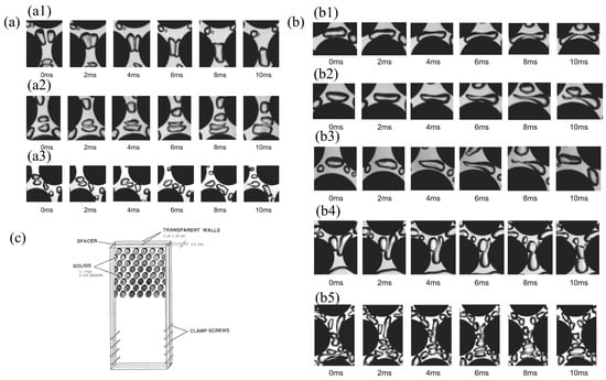 (a) Coalescence mechanisms. Reprinted with permission from Ref. [31]. 2009 Elsevier. (a1) Compression coalescence mechanism at a vertical channel, (a2) decelerating coalescence mechanism at the outlet of a vertical channel, and (a3) decelerating coalescence mechanism at the outlet of a horizontal channel. (b) Coalescence mechanisms. Reprinted with permission from Ref. [31]. 2009 Elsevier. (b1) Shear breakup mechanism by equal shear forces, (b2) shear breakup mechanism by unequal shear forces, (b3) acceleration breakup mechanism, (b4) impact breakup mechanism at lower superficial velocities, and (b5) impact breakup mechanism at higher superficial velocities. (c) “Two-dimensional” packed bed from Melli et al. (1990) [66]. This work is openly licensed via CC BY 4.0.