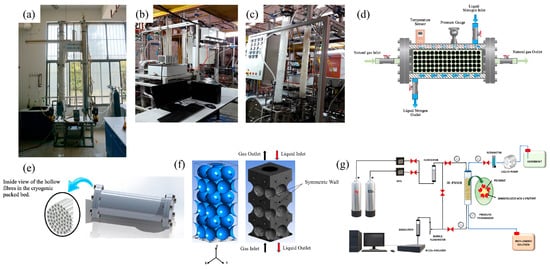 (a) Photo of CO2 capture equipment in the lab of East China University of Science and Technology. Reprinted with permission from Ref. [76]. 2016 Elsevier. (b,c) Pilot-scale CO2 absorption/desorption unit in the University of Malaya. Reprinted with permission from Ref. [77]. 2020 American Chemical Society. (d,e) Cryogenic packed bed used in this research work. Reprinted with permission from Ref. [78]. 2019 Elsevier. (f) 3D geometry and meshed model [79]. 2018 this work is openly licensed via CC BY 4.0. (g) IE-PBMR experimental setup. Reprinted with permission from Ref. [80]. 2022 Elsevier.