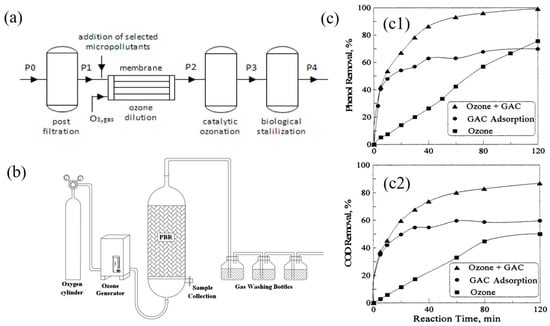 (a) Schematic flowchart of the pre-industrial-scale unit from Vedaraman et al. [99]. 2024. This work is openly licensed via CC BY 4.0. (b) Schematic of experimental setup. Ozonation process in PBR for removal of AB 52 dye. Reprinted with permission from Ref. [99]. 2012 Springer-Verlag Berlin Heidelberg. (c) Phenol (c1) and COD (c2) removal for ozonation, GAC adsorption, and combined GAC adsorption and ozonation from Lin et al. [100]. 2003. This work is openly licensed via CC BY 4.0.