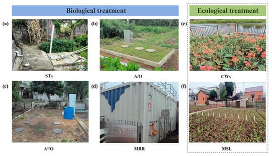 Physical drawing of rural domestic sewage (RDS) treatment/purification. (a) Three-compartment septic tanks (STs); (b) anaerobic–aerobic (A/O)) process; (c) anaerobic/anoxic/oxic (A2/O) process; (d) membrane reactor (MBR); (e) constructed wetland system (CWs); (f) multiple-soil-layering systems (MSL).