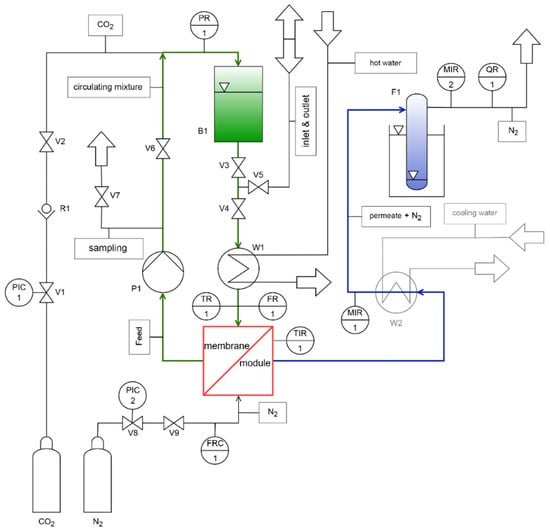 Approximately 1 L of a defined mixture consisting of DEC, ethanol, and water (feed mixture) was filled into the tank (B1). Subsequently, the feed was pumped through a heat exchanger (W1) to reach the operating temperature. A water bath provided the operating temperature of the membrane module connected to a tube wrapped around the module. Tank B1 was pressurized through a feed line by introducing CO2 after a consistent operating temperature was reached. Following this, a continuous carrier gas flow (N2) on the permeate side of the membrane module was released under atmospheric pressure. The permeate was separated from the carrier gas flow by condensation with subsequent collection in a separator (F1), which maintained a temperature range between −15 °C and −20 °C due to a salted iced water mixture. This temperature range was selected because of the anticipation of a high water content in the permeate. It is sufficiently low to separate water without causing freezing or condensation in the pipes of the carrier gas. A Liebig condenser (W2) with a collecting flask was also used in high permeate flow cases. The volume flow of the circulating mixture was adjusted to a flow of 1.5–1.7 L/min.