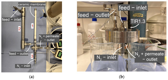 After several decades of comparatively high raw material security in industrialized countries, issues such as the procurement of raw materials are once again becoming the central focus of researchers and businesses. Significantly changed regulations in industry, natural disasters, and the shift in political interests result in a stronger emphasis on realignment towards a more sustainable raw material supply chain [1]. In the course of this, industrial residues are also being re-evaluated for further use, as are conventional technologies. In particular, separating liquid–liquid mixtures, often carried out by distillation, is considered energy-intensive. This can frequently be replaced entirely by pervaporation (PV) membrane technology. Pervaporation represents a separation technology in which a liquid mixture (feed) is brought into contact with one side of a membrane. The fraction that passes through the membrane (permeate) is withdrawn as a low-pressure vapor (vacuum) or with a gaseous compound (sweep gas), diluting the product on the permeate side. Major influencing parameters of the transport of permeating compounds are the chemical potential difference of the compounds on both sides of the membrane, as well as interactions between the permeate’s and the membrane’s selective layer, along with its mobility within the membrane matrix [2]. The comparatively low demands and increasing possibilities for a compact design of pervaporation open up new opportunities for recovering valuable liquid materials and new options for integrating the separation of product mixtures [3].