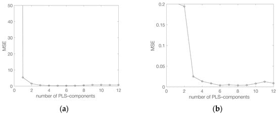 The optimum number of PLS components was determined via mean squared error (MSE), which was calculated from models with a number of PLS components ranging 1–12. This step is necessary to prevent underfitting or overfitting [31]. Additionally, during the calculation of these models, ethanol and DEC were evaluated together, while water was evaluated separately to achieve a better predictive performance. The MSE was determined for all models and applied to the number of PLS components (see Figure 3). If the concentration is predicted via PLS regression, the MSE is generally defined by