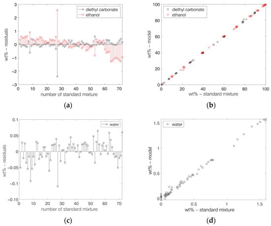 Figure 4a,c illustrates the residuals of each standard mixture. These diagrams provide a good overview of the absolute deviations between the actual mass percentages of the standard mixtures and the mass percentages predicted by the PLS regression model. The standard error summarizes this observation in a single quantity.