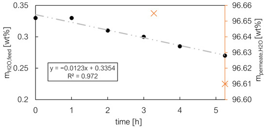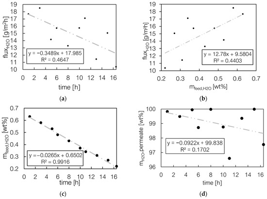 The flux of water decreases on average, as Figure 5a portrays, throughout the test period. Furthermore, Figure 5b demonstrates a correlation between the permeate flow of water and the water content in the feed, illustrating that the water flux decreases as the water content in the feed decreases. A closer look at Figure 5c reveals an almost linear decrease in the circulating water concentration with passing time, depleting the water content in the circulate close to 0.2 wt% after 16.5 h of experimental running time. Further trend development was not assessed, but this data does not reveal a diminishment of the decreasing trend. The permeate was identified to be mainly water (Figure 5d) with a purity of mostly >98 wt%. Despite the trend, significant fluctuations in the measured values can be observed in Figure 5a,b,d. Due to the low sample mass of the permeate, slight fluctuations occurred in the measurements. These fluctuations increase by scaling up to the units shown (Figure 5), which makes the fluctuations appear large. Despite the comparatively poor , a trend can nevertheless be recognized. This is particularly evident in the constant decrease in the water concentration of the circulating mixture, as shown in Figure 5c.