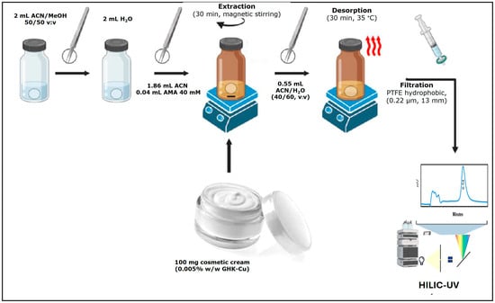 Due to the complexity of the cosmetic cream matrix, the FPSE technique was selected for sample pretreatment, employing a sol-gel membrane composed of MTMS/PheTES/CW20M. Circular disks of the membrane were cut, each having a diameter of 1.5 cm and a surface area of 1.77 cm2. Initially, the membrane was immersed for 5 min in a 2 mL mixture of acetonitrile and methanol (50:50 v/v), followed by a 5 min immersion in 2 mL of deionized water. Afterward, the membrane was placed into a 2 mL glass vial with a screw cap, and 0.04 mL of 40 mM aqueous ammonium acetate (AMA), 1.86 mL of acetonitrile, and 100 mg of cosmetic cream were added. The extraction was conducted with magnetic stirring at 50 rpm for 30 min. Subsequently, the membrane was placed in a 0.55 mL mixture of acetonitrile and water (40:60 v/v) for desorption and heated to 35 °C for 30 min without stirring. Before chromatographic analysis, the resulting extract was passed through a 13 mm hydrophobic PTFE syringe filter with a 0.22 μm pore size. A glass syringe was used during the process to avoid peptide loss, as GHK-Cu can adhere to plastic materials. Figure 1 presents a schematic workflow of the FPSE pretreatment method.