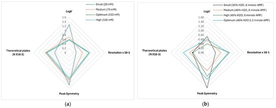 Combined radar charts depicting the impact of (a) ammonium formate concentration and (b) water content percentage on the retention (Logk′), resolution (R × 10−1), peak symmetry (T), and theoretical plates (N × 10−3) of GHK-Cu. Resolution and theoretical plate values have been normalized to ensure all variables are presented in a comparable scale.
