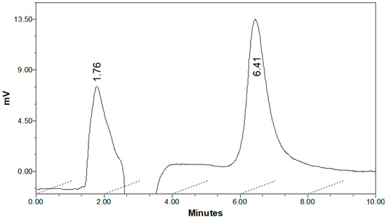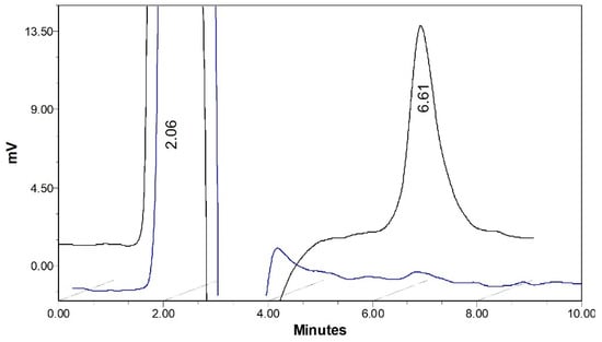 The selectivity of the HILIC-UV method for analyzing GHK-Cu in cosmetic creams was thoroughly evaluated. Figure 7 presents a HILIC-UV chromatogram, comparing a cosmetic cream sample (black line) with a blank cream sample (blue line). Both were analyzed using a ZIC®-pHILIC analytical column, with a mobile phase comprising a 133 mM ammonium formate and acetonitrile in a 40:60 (v/v) ratio. The flow rate was set at 0.2 mL/min, and detection was performed at 224 nm.