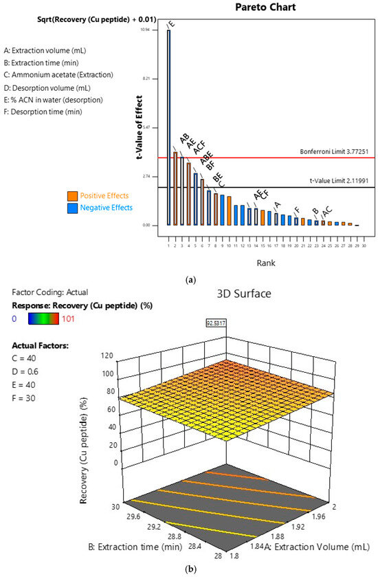This DoE approach offered valuable insights into the influence of various experimental conditions on the % recovery of GHK-Cu from the complex cosmetic cream matrix. As illustrated in the Pareto chart (Figure 6a), the % acetonitrile (ACN) content in the solvent used for desorption had a significant negative impact on the % recovery of GHK-Cu, emerging as the most influential factor with the lowest p-value (p < 0.0001). This negative effect is likely due to the hydrophilic nature of GHK-Cu, which requires a higher water content for effective desorption. Several statistically significant interactions between factors were identified, highlighting the value of the DoE approach in investigating the FPSE procedure. Notably, the interaction between extraction volume and extraction time (AB) positively influenced GHK-Cu % recovery, even though neither factor was individually significant. This is demonstrated in Figure 6b, which presents a 3D surface plot showing the effects of extraction time (min) and extraction volume (mL) on GHK-Cu recovery (%). Additionally, the interaction between extraction volume and the % ACN content in the solvent used for desorption (AE) had a negative impact on % recovery. Another significant interaction was observed among extraction volume, the presence of ammonium acetate (40 μL 40 mM ammonium acetate aqueous solution in the extraction solvent mixture) in the extraction, and desorption time, which collectively had a positive effect on % recovery. These inter-parameter interactions underscore the limitations of the one-factor-at-a-time approach, which would likely have led to suboptimal outcomes in optimizing % recovery.