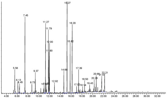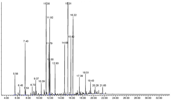 The temperature program used was as follows: the starting oven temperature was held at 60 °C for a time of 1 min, ramped at 10 °C min−1 to 180 °C, further ramped at 20 °C min−1 to 280 °C, and held for 15 min. The temperature of the injector was sustained at 270 °C and the temperature of the detector was 300 °C. An amount of 1 μL of the sample was injected neat, with a split ratio of 1:10. The carrier gas for the GC-MS used was helium exhibiting a flowrate of 1.0 mL min−1. For the mass spectrometry, the ionization electron energy was adjusted to 70 eV. The transfer line was maintained at 250 °C, the ion source was maintained at 230 °C, and the electron multiplier was set to 1568. The total run time was 33 min.