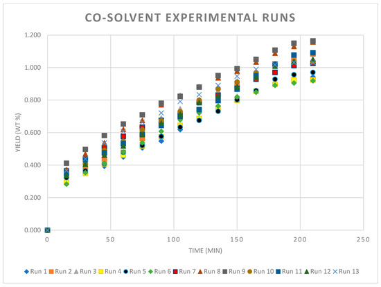 Extraction curve for co-solvent yield of ylang ylang at different operating conditions listed in Table 3.