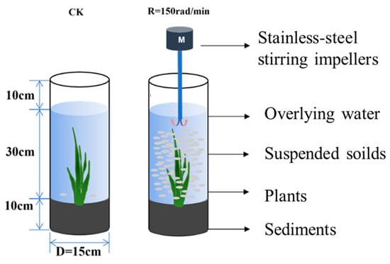 A sediment resuspension system was simulated on an experimental apparatus. As shown in Figure 1, in order to simulate the ratio of the water depth and sediment thickness (3:1), the apparatus consisted of two acrylic columns, each with a diameter of 15 cm and a height of 50 cm, and 10 cm deep sediment was placed into each column and covered with 30 cm of overlying water, while plants were planted. The sediment samples were obtained from the plain river network areas, and V. natans was used to structure the sediment resuspension system. The control group was not treated. The treatments of the sediment resuspension system were stirred thoroughly by a stainless-steel stirrer at the speed of 150 rad/min, controlled by a variable-speed motor, for 1 h per day for a total of 21 days.