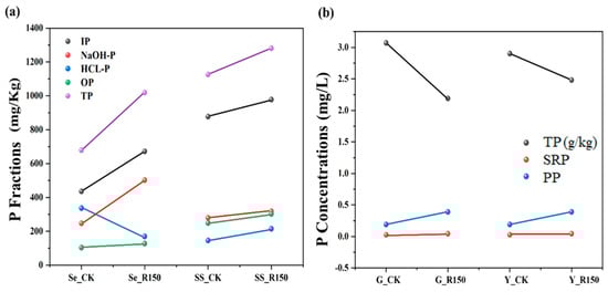 The P contents in the sediments and SSs were measured and the results are shown in Figure 2a. The results showed that the contents of different P fractions increased significantly in the disturbed state, which indicated that sediment resuspension had a significant effect on the release of endogenous P. The content of IP and OP in sediments or SSs had an increasing trend after the disturbance, with the OP content in sediments increasing from 103.345 mg/kg to 127.344 mg/kg, and OP in SSs increasing from 248.552 mg/kg to 302.448 mg/kg. Overall, IP accounted for the major portion of TP, indicating that IP might be more accessible to the water column due to biomineralization and chemical release during the sediment resuspension process, and the increase in TP concentration further confirmed the release of P from the sediments due to the disturbance. In addition, the TP contents of the sediments increased from 678.875 mg/kg to 1019.133 mg/kg, and TP in SSs increased from 1126.017 mg/kg to 1280.679 mg/kg under disturbed condition. The increase in TP suggested that the disturbance enhanced the bioavailability and mobility of P. Disturbance of sediments could result in the P transformation from a fixed form to a more bioavailable form, which would, in turn, affect the nutrient balance and water quality of the water body. P in sediments existed primarily in a chemically precipitated or adsorbed state, and disturbance could destabilize these physical or chemical bonds, releasing P into the water column and leading to an increase in P contents in SSs [26].