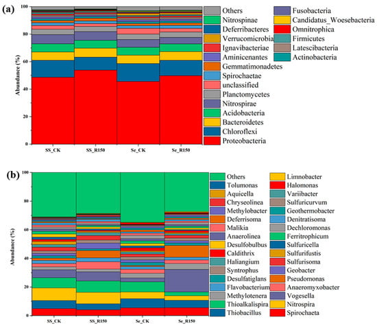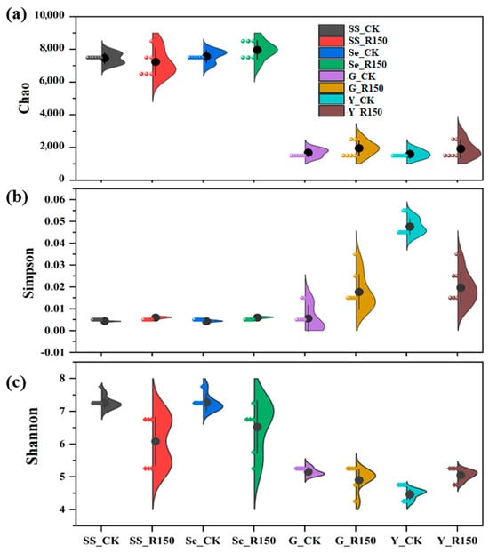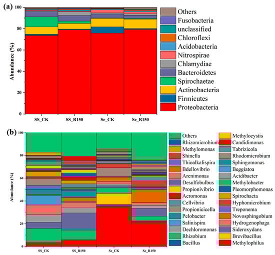The diversity indexes (Chao, Shannon, and Simpson) were also analyzed to discuss the microbial community structure change during the sediment resuspension, and the results are shown in Figure 3. The Chao index mainly reflected the species richness in the microbial community, and the results indicate that there was a significant increase in the Chao index in sediments and leaves of V. natans after the disturbance (R150). In contrast, the diversity indexes of SSs and the rhizomes changed little. After the disturbance, the values of Chao in sediments increased significantly, indicating an increase in species richness, which might be due to the fact that the disturbance resulted in the release of more microorganisms from the sediments into the overlying water. Therefore, there was also an increase in the number of microbial species in SSs [32,33]. The Chao index values of the rhizomes and leaves in V. natans did not change much after the disturbance, probably because the microorganisms on the surface of V. natans were relatively stable and less susceptible to physical disturbance [34]. The previous study suggested that the conditions of sediment resuspension might have introduced more habitat microenvironments due to the physical disturbance, and that allowed microorganisms and nutrients from the sediments to be stirred up into the upper water column, increasing the microbial diversity. In addition, specific anaerobic microorganisms in sediments might enter the aerobic layer as a result of the disturbance and interact with microorganisms in the new environment [26].