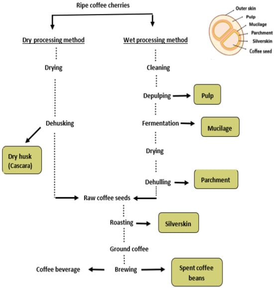 Each coffee cherry comprises several layers—the outer skin (husk), pulp, sticky mucilage, thin parchment, and the coffee silverskin covering the green coffee seeds. A schematic representation of coffee processing is shown in Figure 1. The first step of coffee cherry processing starts with the hull and pulp removal using either a dry or wet method. These processes affect the composition of coffee seeds and their by-products. In the first method, harvested coffee cherries are dried in the sun or using a mechanical dryer. Then, they are hulled using a mechanical system to obtain dried skins of coffee named coffee husk. It is also known under the Spanish name cascara. More steps are involved in the wet method of production, and a greater variety of by-products are produced, such as pulp, cascara, mucilage, parchment, and partially silverskin. During the fermentation process, bacteria, yeast, and fungi break down sugars and pectins and produce alcohols, organic acids, and enzymes. Green coffee seeds are the final product of both processing methods. They are then roasted, and the main by-product of this process is silverskin, a tin tegument located directly around the two seeds of the coffee cherry. The spent coffee grounds (SCGs) are obtained after preparing coffee at the end of the coffee processing as a beverage. During all stages of production, significant amounts of waste are generated, and only about 10% of the coffee cherry ends up in the beverage. Approximately 650 kg of SCG is obtained from 1 ton of coffee seeds []. Iriondo-DeHond et al. reported that in Columbia, from 100 kg of mature Arabica coffee cherries during wet processing, as many as 39 kg correspond to skin and pulp, 22 kg to mucilage, and 39 kg to parchment [].