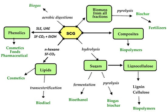 The scheme of an integrated biorefinery approach for the valorization of spent coffee grounds. SCG—spent coffee ground; SLE—solid–liquid extraction; SF-CO2—supercritical fluid extraction with carbon dioxide; UAE—ultrasound-assisted extraction; EtOH—ethanol.