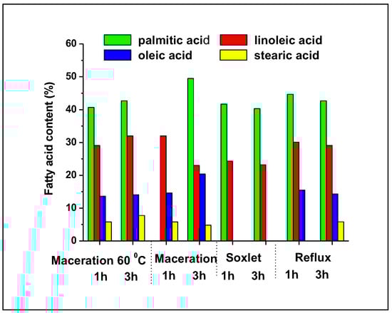 Different extraction methods for treating SCG, such as maceration, Soxhlet, UAE, MAE, and SFE, were reported and compared to show those with higher lipid yield and lower acid value. As in any extraction procedure, time, temperature, pressure, and solvent-to-sample ratio affect its efficiency. According to Kanlayavattanakul et al. [], maceration with heptane without heat for 1 and 3 h was optimum as cost-effective and more feasible in industrial production. The oils mainly contained palmitic (38–49%), linoleic (22–33%), oleic (14–21%), and stearic (5–6%) acids (Figure 4). Maceration gave a higher linoleic acid content than Soxhlet and reflux methods. This unsaturated fatty acid is an important component of cosmetics to treat hyperpigmentation and reduce inflammation []. It was reported that SGC heptane extract from the instant coffee industry contained a higher oil fraction (24.3 wt.%) than from the expresso machine (14.8 wt.%) []. The pretreatment of SCG by non-thermal plasma (30 W, 10 min) or ultrasounds (40 kHz, 10 min) before Soxhlet extraction with n-hexane improved the extraction efficiency with a yield of 19.25% and 14.38%, respectively, compared to the control (9.41%) []. The use of natural deep eutectic solvents (NADES) in the pretreatment stage, followed by n-hexane extraction using UAE, also increased the yield of coffee oil [].