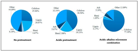 The pretreatment step of coffee by-products in bioethanol production allows for obtaining a lignocellulosic fraction whose composition of complex polysaccharides depends on the used conditions [,]. Its main component is lignin, a natural phenolic polymer, which binds carbohydrate polymers cellulose and hemicellulose. This fraction could be used directly or after a fermentation step to produce biopolymers and composites [,,,,]. The removal of fats is recommended before alkali extraction []. The diversity of components in lignocellulosic biomass provides high resistance to chemical, enzymatic, and microbial attacks; thus, a pretreatment step is needed to destroy the interaction between components [,]. This step increases biomass surface area, improves raw materials’ porosity, and separates hemicellulose and lignin. Figure 5 presents the content of coffee pulp components after acidic pretreatment (6% H2SO4, 140 °C for 45 min) and a combination of acid-alkaline-microwave pretreatment []. The alkaline step was performed after washing and drying the previously obtained solids using a 2% NaOH solution at 120 °C for 20 min and was followed by microwave treating at 300 W for 20 min. Based on the fibre composition, the combined pretreatment gave the best results, as this procedure reduced hemicellulose and lignin contents by 71.4% and 79.2%, respectively, while the remaining solid consisted of 77.5% cellulose.
