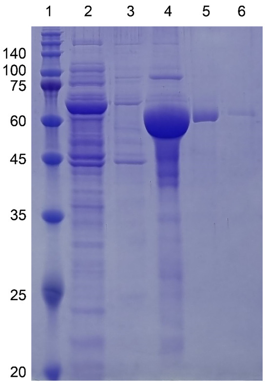 SDS-PAGE gel images of MBP-I48 (63.4kDa) along the purification steps. All buffers contained 10 mM sodium phosphate pH 7.4 with 150 mM NaCl. Lane 1, Size marker; lane 2, flow-through fraction upon loading on to HisTrap column; lanes 3, 4, and 5, elution fractions with 10, 250, and 500 mM imidazole at room temperature; lane 6, elution fraction with 500 mM imidazole at ice cold temperature. Molecular sizes are denoted next to the size marker bands.