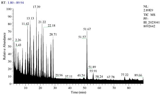 Total ion chromatogram of digested rhCOL-III. (The green line is used to label the retention time of the peaks).