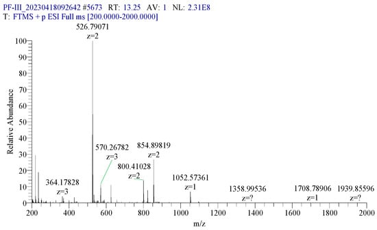 The samples (0.5 mL) prepared in Section 2.5.2 were mixed with 5 μg or 20 μg trypsin (100 μL), respectively. Then, they were incubated at 37 °C for 24 h. In order to terminate the enzymatic reaction, 10% formic acid solution (60 μL) was added to rhCOL-III digestion. The enzymatic hydrolysate was centrifuged at 12,000× g for 10 min, and the supernatant was collected.