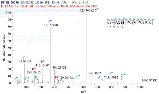 Firstly, the marker peptides of rhCOL-III were identified using HPLC-MS/MS. Figure 1 shows the total ion chromatogram of digested rhCOL-III. Subsequently, the mass spectrometric data were analyzed using BioFinder software. In order to retrieve more peptides and exclude peptides undergoing modifications in marker peptides screening, the common modifications, such as oxidation and dethiomethylation of methionine, deamidation of asparagine and glutamine, pyroglutamylation of glutamine and glutamic acid, ammonia-loss, and acetylation of the nitrogen terminal were set up in BioFinder software. The peptides identified in rhCOL-III with no modification sites and which do not exist in other animals can be used as the target peptides. Figure 2 shows the MS spectrum of m/z 526.79071 with two charges. Therefore, the molecular weight of m/z 526.79071 was 1051.566 Da, which was consistent with the molecular weight of the peptide (GEAGIPGVPGAK). Figure 3 shows the MS/MS spectrum of m/z 526.79071. The MS/MS ions in Figure 3 are match well with the theoretical product ions of the peptide (GEAGIPGVPGAK). The peptide (GEAGIPGVPGAK) had no modification sites and only existed in rhCOL-III. Therefore, the peptide (GEAGIPGVPGAK) could be used as the marker peptide of rhCOL-III.