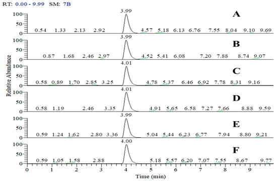 Sample preparation: Four groups of the samples prepared in Section 2.5.1 and three actual dressing products were used to validate the pretreatment method. First of all, they were treated using the solvent displacement methods listed in Section 2.5.2. Then, they (0.5 mL) were mixed with 20 μg trypsin (100 μL) and incubated at 37 °C for 24 h, respectively. At last, 10% formic acid solution (60 μL) was added to the digestion. The enzymatic digestion was centrifuged at 12,000× g for 10 min, and the supernatant was collected.