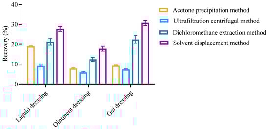 The dressing matrix was very complex and varied in different dressings. In this study, group C (prepared in Section 2.5.1) was used as the simulated dressing samples. In order to exclude the influence of matrix on the quantitative results, four different pretreatment methods, including acetone precipitation, centrifugal ultrafiltration, dichloromethane extraction, and solvent displacement, were compared. Figure 5 shows the effects of different pretreatment methods on the recoveries in simulated rhCOL-III dressings. The results showed that the recoveries of the centrifugal ultrafiltration method, acetone precipitation method, and dichloromethane extraction method were lower. In these three simulated rhCOL-III dressings, the recovery of the solvent displacement method was higher than the other three methods.