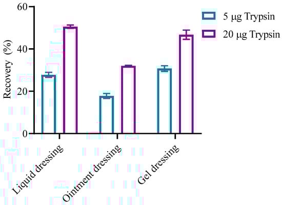 The carbomer in the three dressings can inhibit the activity of trypsin. Therefore, trypsin dosage was an important factor which could affect recovery rates. To ensure that rhCol-III in the dressing sample can be fully enzymatically hydrolyzed, excessive trypsin was added to the samples. In this study, 0.5 mL of the three simulated rhCOL-III dressing samples was mixed with 5 μg or 20 μg trypsin, respectively. The effect of enzyme dosage on the recovery of rhCOL-III was analyzed. Figure 6 shows the effect of different trypsin dosages on the recovery of rhCOL-III in simulated rhCOL-III dressings. The results showed that the recoveries of rhCOL-III using 20 μg trypsin digestion in three rhCOL-III dressings were all significantly higher than those of the 5 μg group. The results indicate that the increase in trypsin dosage could effectively increase the recovery rate of rhCOL-III in simulated rhCOL-III dressings.