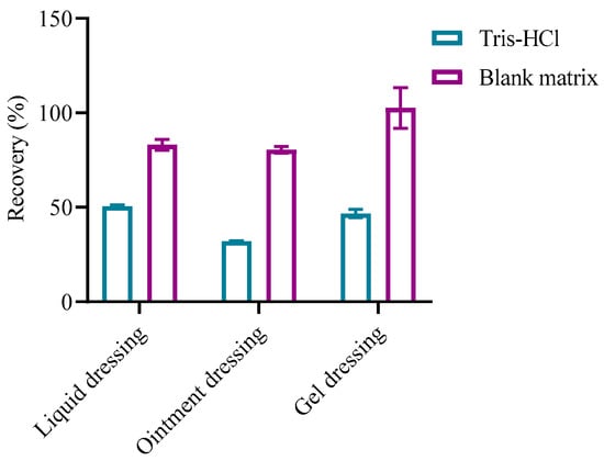 The matrix effect is an important factor in mass spectrometry quantification. The contents and properties of the matrix will affect the ionization efficiency of the target compounds, resulting in the enhancement, weakening, or deviation of the mass spectrum signal. Thus, an rhCOL-III reference working solution was prepared with a blank matrix, and the recovery was compared with the results of the Tris-HCl method. Figure 7 shows the recovery of rhCOL-III in three simulated dressings obtained by the working solution curve method of the blank matrix and Tris-HCl prepared as a reference. The recoveries of rhCOL-III obtained by the method of blank matrix prepared as a reference working solution curve were all between 80% and 120%, which met the requirement of the recovery rate in the methodology.