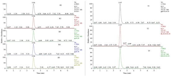 The MS spectra of the marker peptide in different medical dressing products (T1—liquid dressing; T2—ointment dressing; T3—gel dressing) and rhCOL-III reference samples (R1—5 μg/mL; R2—10 μg/mL; R3—20 μg/mL; R4—50 μg/mL; R5—100 μg/mL).