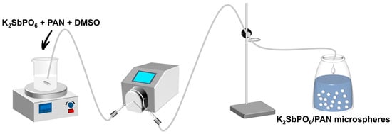 As shown in Figure 1, K2SbPO6 (1.00 g), PAN (0.40 g), and DMSO (6 mL) were stirred in a beaker for 2 h to form a uniform and viscous suspension. A peristaltic pump was used to pump the suspension into a container containing a large amount of DI water at a flow rate of 0.5 mL min−1, and a large number of microspheres were formed. The microspheres in the container were repeatedly washed with DI water and then dried in an oven at 40 °C for 12 h to obtain K2SbPO6/PAN composite microspheres.