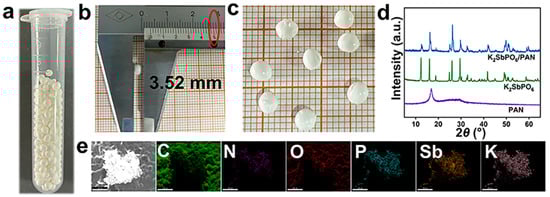 (a) Photograph of as-prepared K2SbPO6/PAN microspheres in a 10 mL centrifuge tube. (b) Illustration of the measurement of the size of a K2SbPO6/PAN microsphere by a vernier caliper (specification 0.02 mm). (c) Photograph of several K2SbPO6/PAN microspheres. (d) PXRD patterns of PAN, synthesized K2SbPO6, and K2SbPO6/PAN microspheres. (e) Elemental distribution mapping of K2SbPO6/PAN microspheres.
