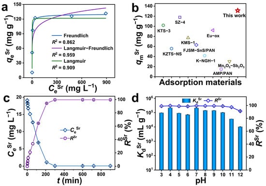 In order to determine the maximum adsorption capacity of K2SbPO6/PAN microspheres for Sr2+ ions, the isothermal adsorption experiment was carried out. The isothermal adsorption experimental data were fitted with the Langmuir, Freundlich, and Langmuir–Freundlich models, respectively. The data show that the correlation coefficient (R2 = 0.959) of the Langmuir–Freundlich model of K2SbPO6/PAN microspheres for Sr2+ ions is higher than that of the Langmuir model (R2 = 0.909) and the Freundlich model (R2 = 0.862) (Figure 3a and Tables S2 and S3). This indicates that the adsorption equilibrium of Sr2+ ions is more consistent with the Langmuir–Freundlich model. According to the Langmuir–Freundlich model, the maximum adsorption capacity for Sr2+ ions (qmSr) of K2SbPO6/PAN microspheres is calculated to be 131.15 mg g−1, which is lower than that of the pristine K2SbPO6 (qmSr = 175.90 mg g−1).