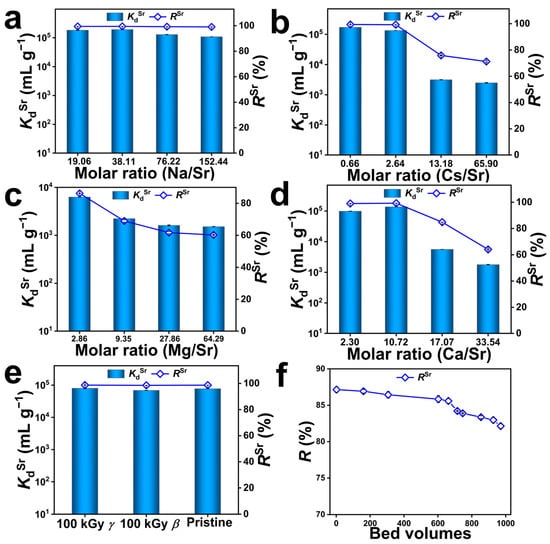 KdSr and RSr of K2SbPO6/PAN microspheres at different molar ratios of Na/Sr (a), Cs/Sr (b), Mg/Sr (c), and Ca/Sr (d). (e) KdSr and RSr of K2SbPO6/PAN microspheres before and after irradiation. (f) Curve of RSr versus bed volume for the adsorption column packed with K2SbPO6/PAN microspheres.