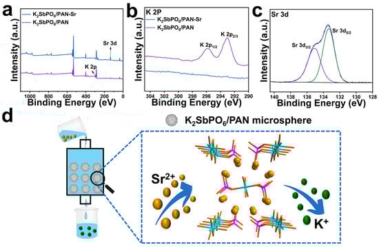 In order to elucidate the mechanism of Sr2+ ions removal by K2SbPO6/PAN microspheres, the samples before and after adsorption of Sr2+ ions by K2SbPO6/PAN microspheres were characterized. The K2SbPO6/PAN microspheres loaded with Sr2+ ions (K2SbPO6/PAN-Sr) were obtained by immersing 200 mg K2SbPO6/PAN microspheres in 200 mL solution containing 500 mg L−1 Sr2+ ions for 12 h. The K2SbPO6/PAN microspheres and K2SbPO6/PAN-Sr were tested by EDS and XPS. EDS results show that K+ ions are replaced by Sr2+ ions after Sr2+ adsorption of K2SbPO6/PAN (Figure S7). XPS spectra show that K2SbPO6/PAN microspheres have characteristic peaks of K 2p1/2 (295.7 eV) and K 2p2/3 (292.9 eV) (Figure 5a,b) [44,47]. On the contrary, after Sr2+ adsorption by K2SbPO6/PAN microspheres, the characteristic peaks of the K element disappear (Figure 5b). Meanwhile, the new characteristic peaks of Sr 3d3/2 (135.10 eV) and Sr 3d5/2 (133.20 eV) are found (Figure 5c) [43,47]. The above results confirm that the mechanism of Sr2+ ion removal by K2SbPO6/PAN microspheres stems from the ion exchange between Sr2+ ions and exchangeable K+ ions in K2SbPO6 (Figure 5d) [24]. PAN primarily contributes to the formation of the microsphere structure.