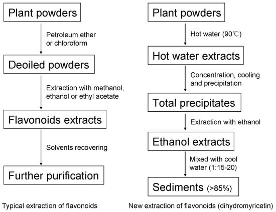 In recent decades, numerous extraction methods have been reported on the isolation of flavonoids from various plant materials. These traditional extraction methods of flavonoids from plant powders could be categorized as direct extraction by solvents [104], alkali extraction, acid precipitation [104,105], lead acetate precipitation [104], and supercritical fluid (liquid CO2) extraction [106]. Alkali extraction, acid precipitation and lead acetate precipitation produce massive water waste and pollute environments, and could not be used in industrial extraction. Extraction with supercritical fluid (liquid CO2) was of a high cost and could not be used on a large scale, although it was environmentally friendly. Hence, selection of the suitable liquid solvents for extraction of flavonoids was essential for the flavonoid industry. Organic solvents such as ethanol, methanol, and ethyl acetate [107,108] were widely used in the extraction of flavonoids. In the traditional extraction process, toxic solvents, such as petroleum ether and chloroform, were usually used for de-oiling treatment, before flavonoid extraction [104]. Solvents such as methanol, ethyl acetate, petroleum ether, and chloroform always produced solvent residues and environmental pollution, and were regarded as not in compliance with good manufacturing practice (GMP). In all these extraction solvents, pure water and food-grade ethanol are considered safe and environmentally friendly, so the suitable extraction of flavonoids with water or ethanol should be developed for industrial application.
