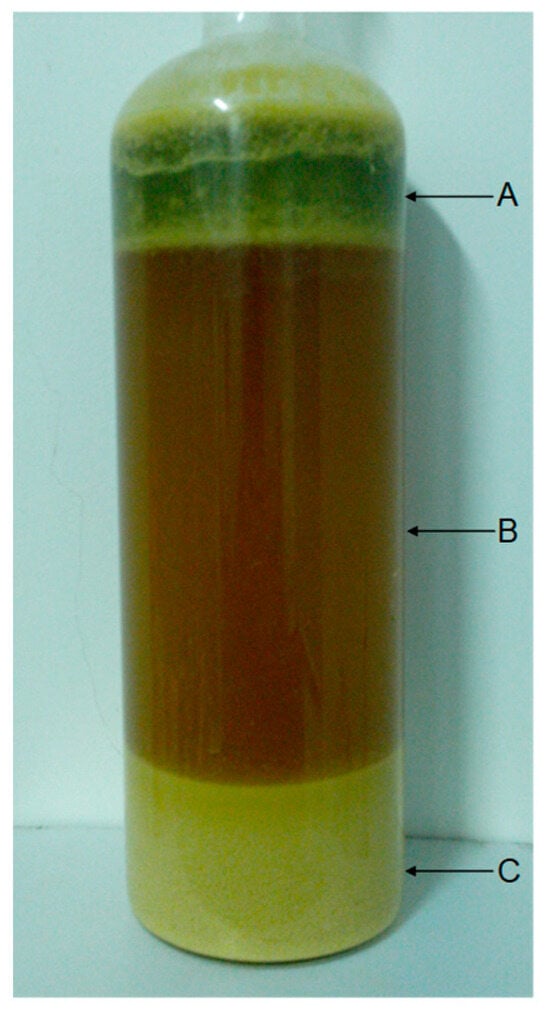 Precipitation purification process of dihydromyricetin (ethanol extracts/cool water = 1/20): A = chlorophylls and other lipids; B = water soluble polyphenols; and C = dihydromyricetin precipitates (>85% in the first cycle, >95% after three cycles) [12,99].