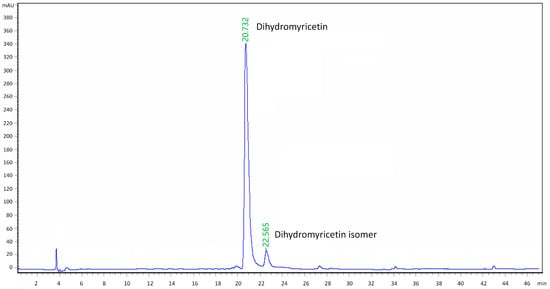 Take dihydromyricetin separation as an example (Figure 2) [12,99,100]. Dihydromyricetin and other components, including polysaccharides, starches, proteins, chlorophylls, and other fatty compounds were first pressure-extracted using 90–100 °C water at 1.0 MPa, then, the hot water extracts were concentrated and treated with precipitation at a low temperature (0–10 °C). The precipitates were separated, dried, ground, and re-extracted by ethanol (95%, v/v).In this ethanol extraction process, dihydromyricetin was separated from the water-soluble impurities, such as proteins, starches, and polysaccharides, and in the vacuum concentration process of the ethanol extracts at 60 °C, fat-soluble compounds were precipitated first (Figure 3). UV-visible spectra of the precipitates from the concentration of ethanol extracts showed no absorption peak (290 nm) of dihydromyricetin (Figure 3), which meant that dihydromyricetin was well isolated from these fat-soluble compounds. Finally, the concentrated ethanol extracts were gradually mixed into cool water (0 °C) in the ratio of 1:20 (ethanol extracts/cool water=1/20), mL/mL to slowly precipitate dihydromyricetin (Figure 4). In this gradual precipitation, dihydromyricetin was further separated from the water-soluble polyphenols, and so were the fatty compounds such as chlorophylls or other oils (Figure 4). With this extraction method, dihydromyricetin of 85% purity was obtained in the first cycle, and after three such separating cycles, highly purified dihydromyricetin could be obtained (Figure 5), with purity over 95%, while the 5% impurities were mostly polyphenols, which were co-precipitated with dihydromyricetin by molecular absorption. Based on the published data [12,99,100], the methods for the separation of dihydromyricetin from vine tea (Ampelopsis grossedentata) were optimized as described above (Figure 2, Figure 3, Figure 4 and Figure 5),and successfully used in the vine tea industry.