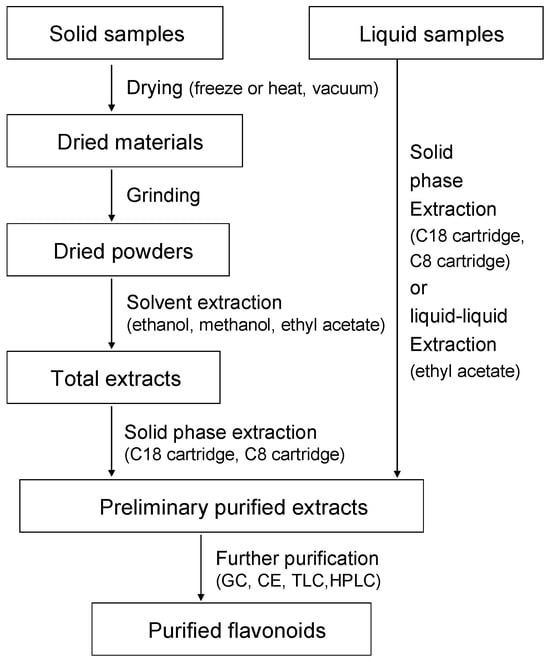 The quantitation of flavonoids is very important in the separation of flavonoids. Sample preparation is the first step for flavonoid quantitation. Sample preparation depends on the nature of analytes (e.g., specific flavonoids subclasses or total polyphenolic compounds, aglucones or glycosides) and samples (e.g., physical state). Samples such as plant powders, foods, and liquids (fruit juices) are usually treated separately. The solid samples and fresh fruits are usually dried and ground into powders and extracted with suitable solvents, while liquid samples such as wine, drinks or fruit juices are always isolated by liquid–liquid extraction or solid phase extraction (Figure 6).