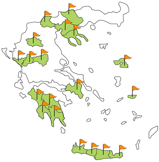 Honey samples were collected from different areas in Greece during 2023–2024 (Figure 1). Individual beekeepers and public authorities proceeded to sampling in the context of monitoring several chemicals in apicultural commodities related, in some cases, to bee intoxication incidents. All honey samples (n = 52) were stored in closed glass containers (entirely filled) and directly stored in the refrigerator (−80 °C) until analysis. Honey used as a control sample was obtained from beehives of organic apiculture origin.