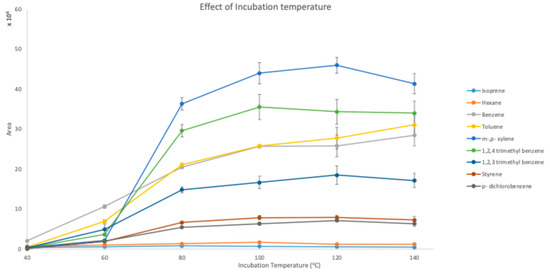 Despite the several reports on the chemical analysis of VOCs in a multitude of matrices, the gas chromatographic and tandem mass spectrometric parameters/conditions are not equally elaborated, possibly due to the relatively low molecular weight of these molecules. The latter might have a strong impact on the analytical method performance. In this context, in the present work, the most abundant VOCs (isoprene, hexane, benzene, toluene, styrene, 1,2,4-trimethylbenzene, 1,2,3-trimethylbenzene, xylenes, and p-dichlorobenzene) covering the boiling point range for the 25 target VOCs were employed to optimize the operation parameters of the headspace utility, thus maximizing the sensitivity of the HS-GC-MS/MS technique [44,47,59,60]. Figure 2, Figure 3 and Figure 4 show the dependence of VOCs’ sensitivity on incubation time (Figure 2), incubation temperature (Figure 3), and matrix modifier (Figure 4) under various conditions.